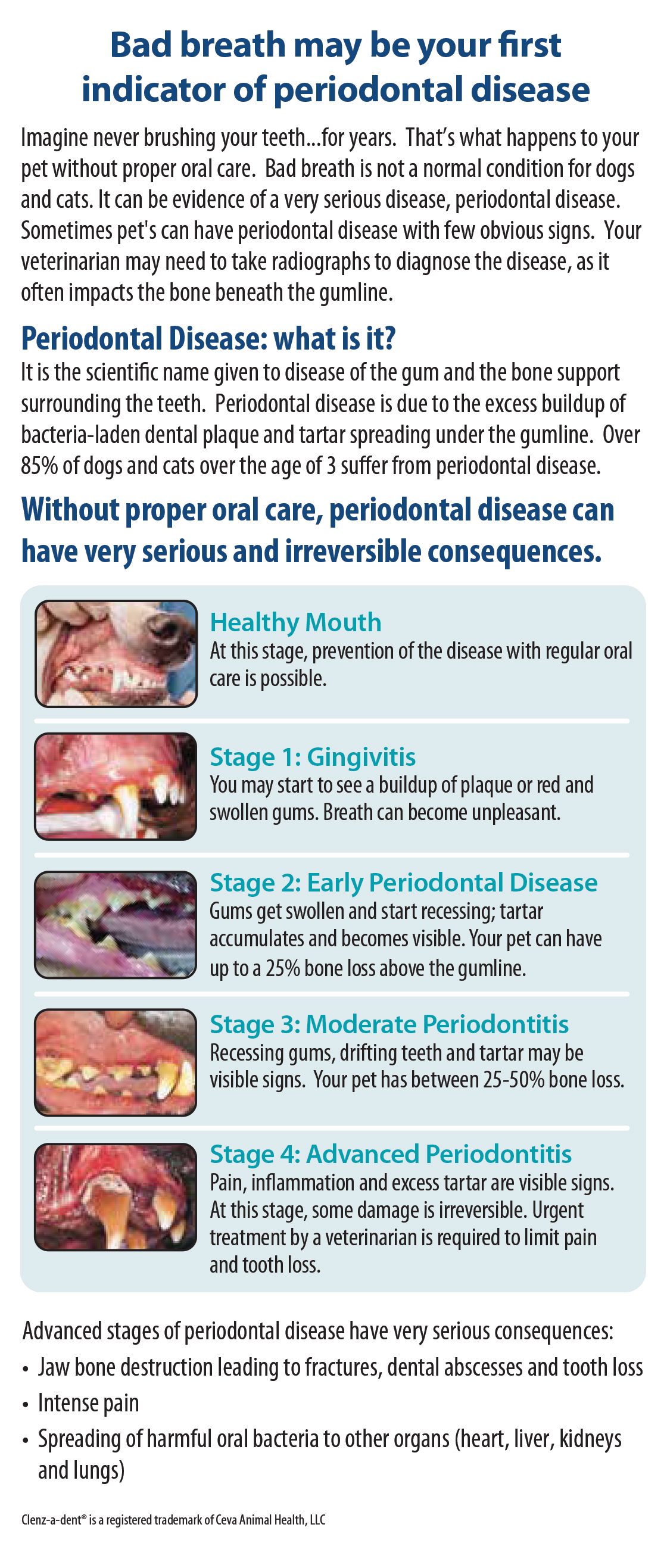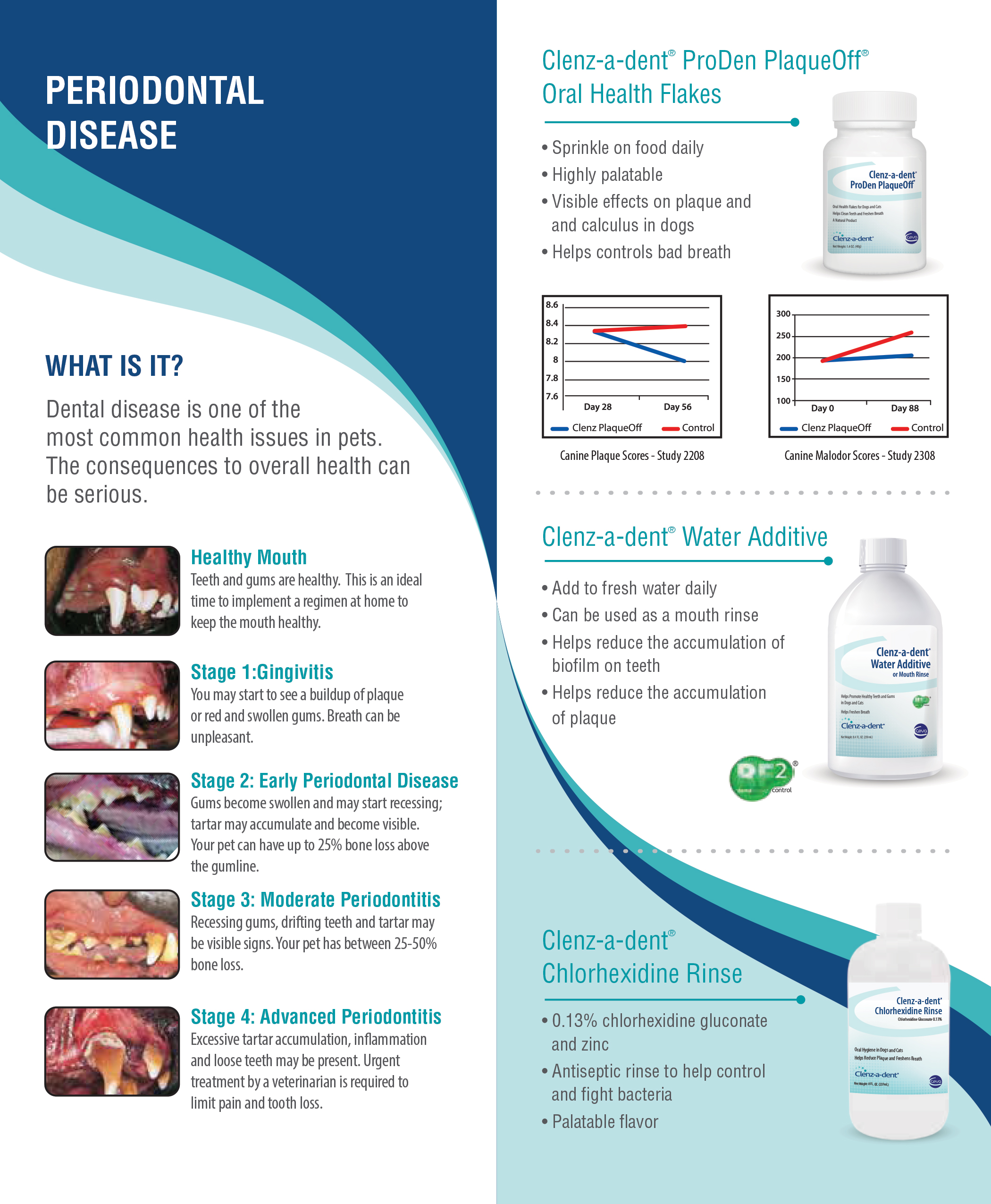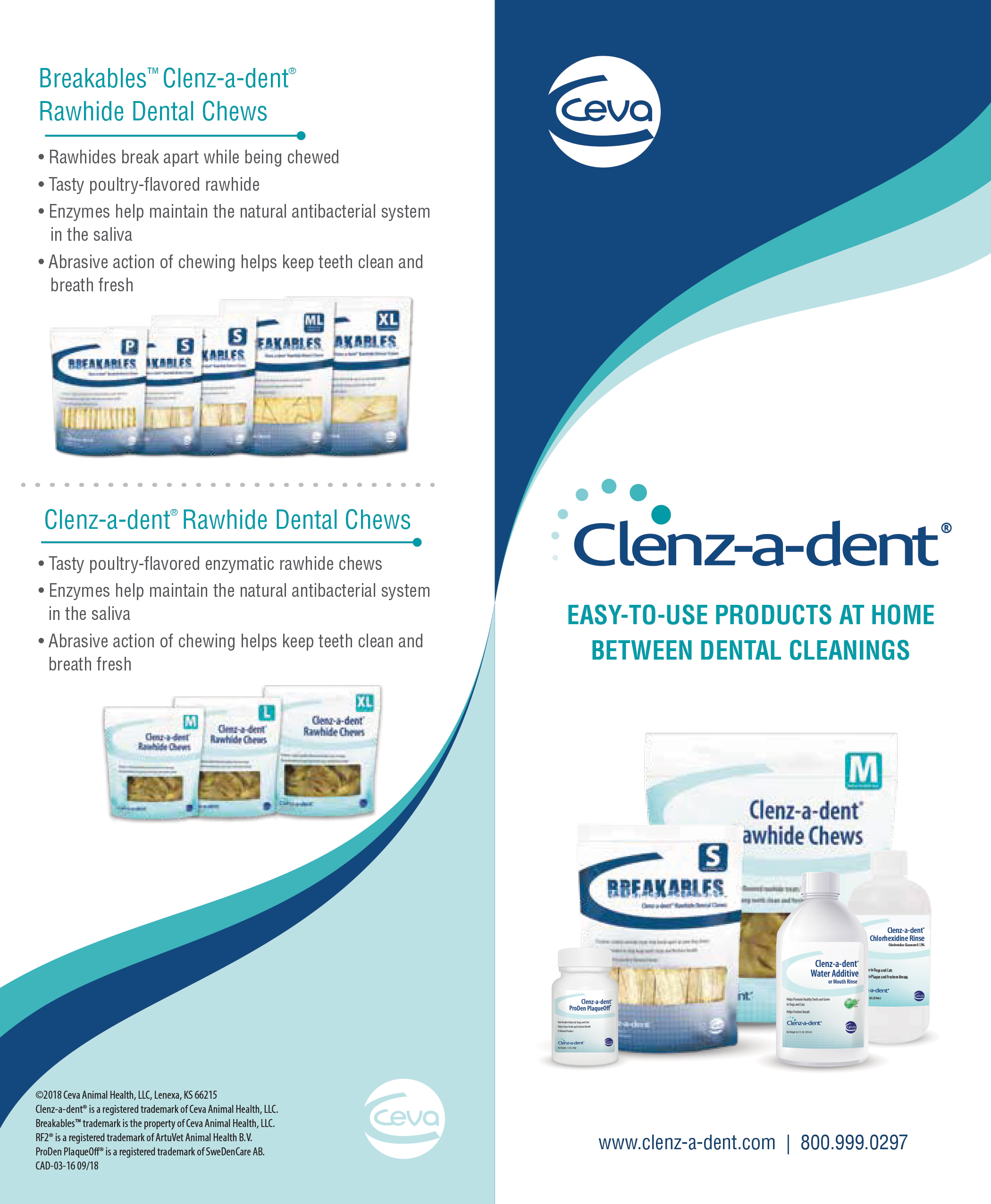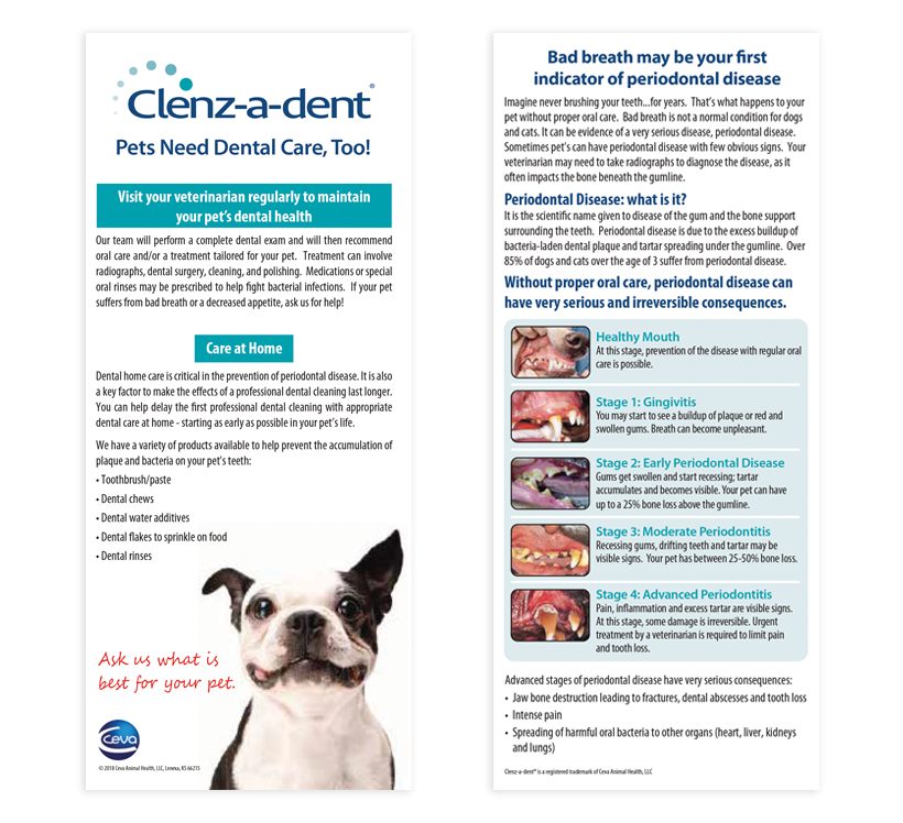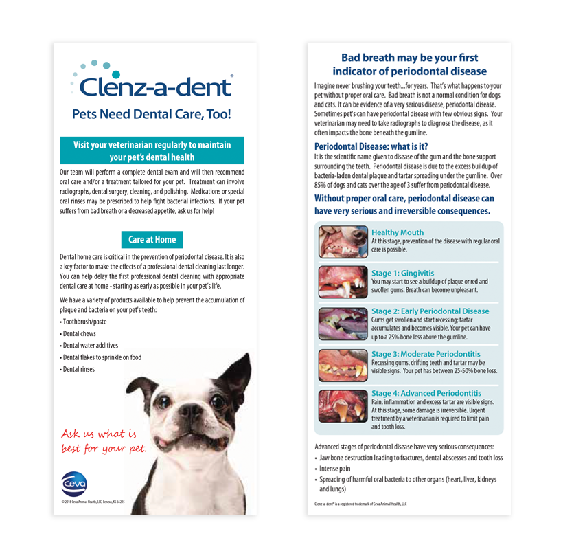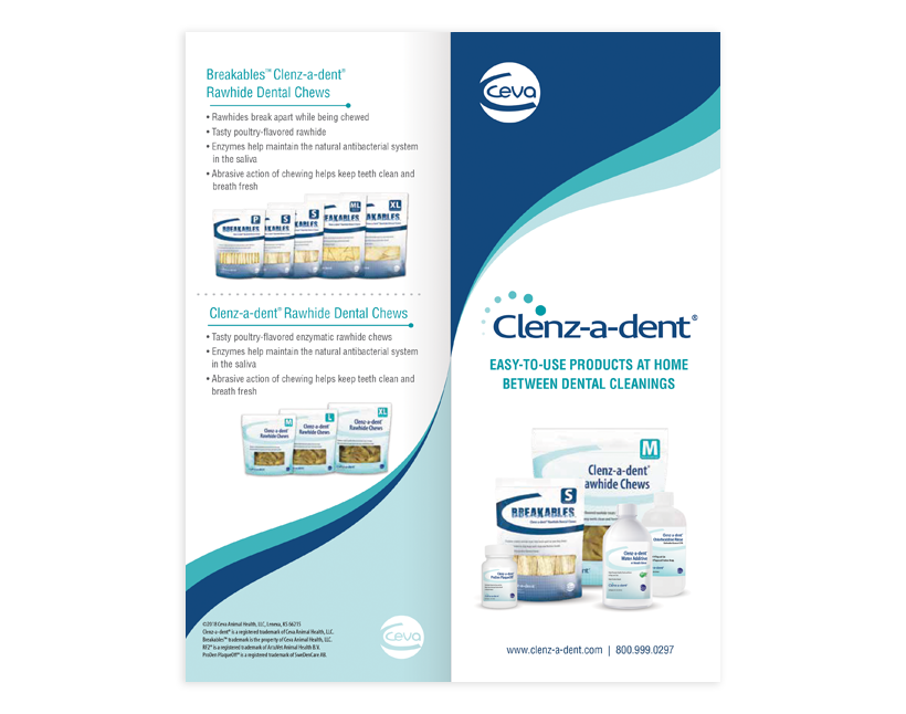 5.5” x 11” (folded) brochure highlights what makes each CLENZ-A-DENT® product palatable, helpful and easy to use. It also lists the stages of periodontal disease and how to recognize when an animal may have this disease.