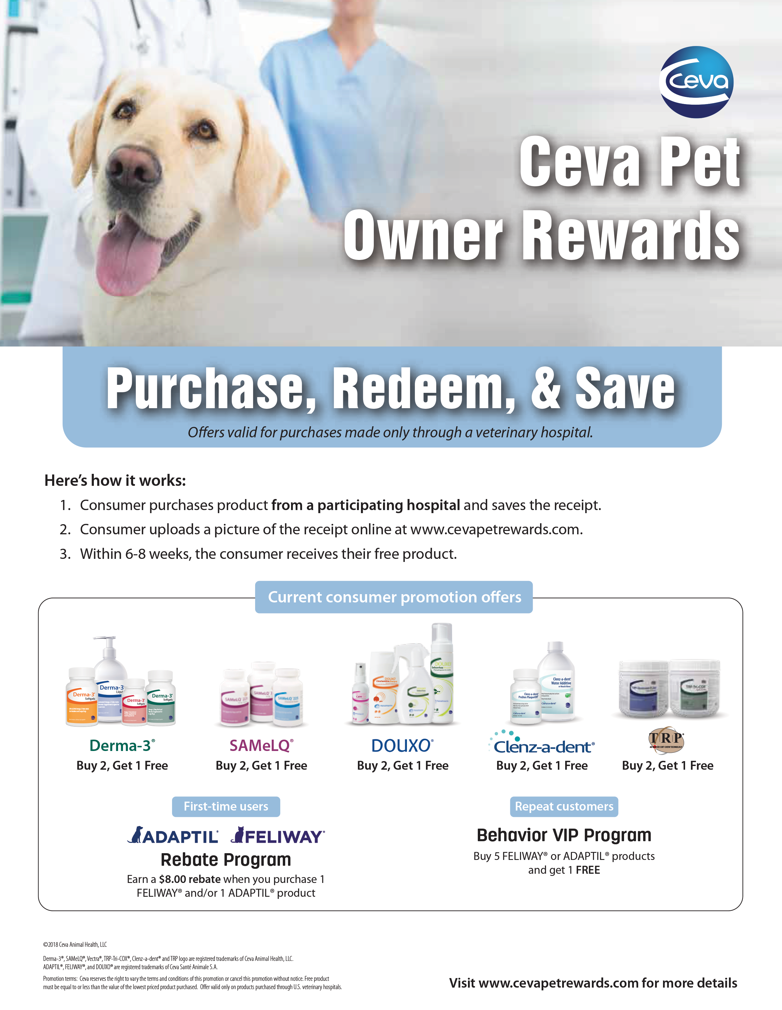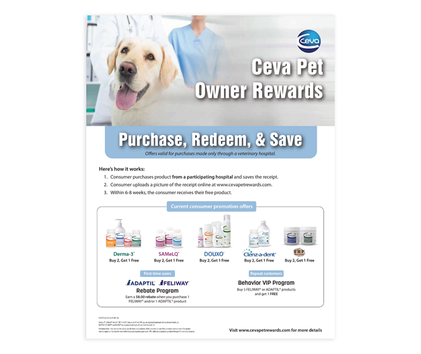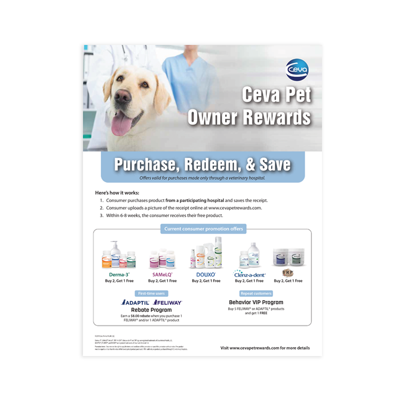 8.5” x 11” flyer that advertises all the consumer reward programs currently available through Ceva. These reward programs are only valid when products are purchased through a veterinarian. Start the conversation and earn customer loyalty with Ceva Pet Rewards.