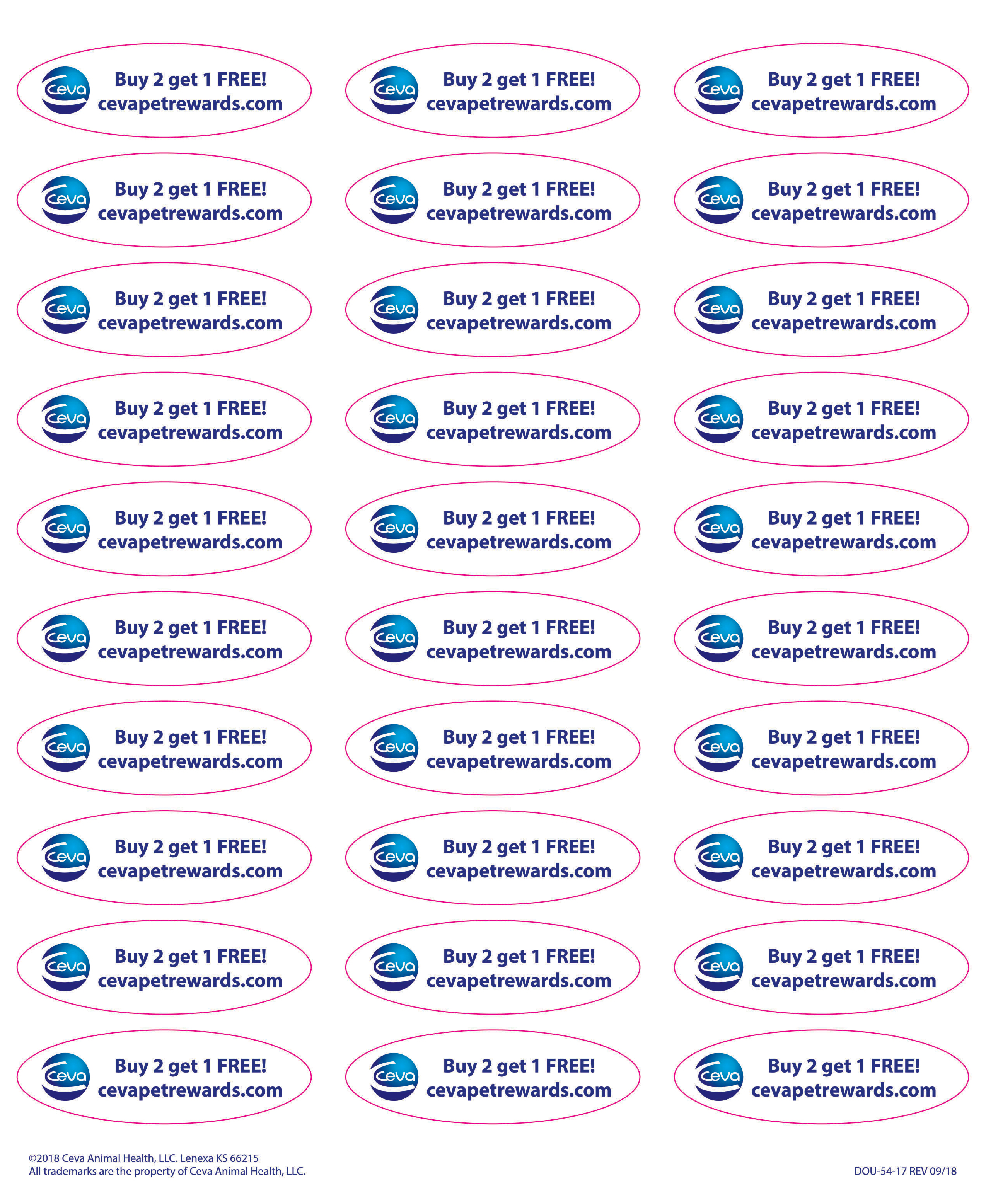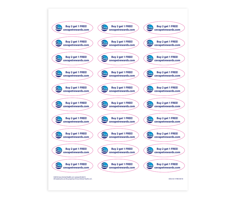 8.5” x 11” sheet of paper containing 30 stickers. Each sticker says “Buy 2 get 1 FREE! cevapetrewards.com”. Place these on Ceva products in your clinic to generate excitement about consumer promotions and help retain loyal customers.